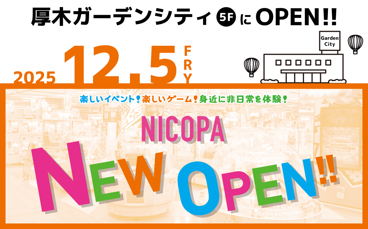 厚木ガーデンシティ5Fにある「NICOPA」は、家族みんなで笑顔になれるアミューズメント施設です!人気の景品やお菓子がたくさん入った大小さまざまなクレーンゲームコーナー、マリオカートや太鼓の達人など人気の体感型ゲーム機や、メダルゲームコーナーでは、小さなお子さまから幅広い年代のお客様にお楽しみいただけるメダルゲーム機があつまっています!