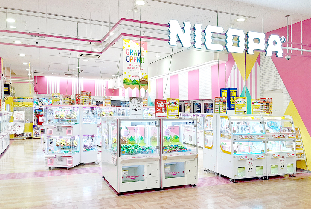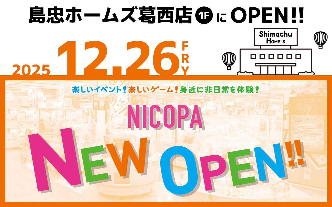 島忠ホームズ葛西店1階にある屋内アミューズメント施設「NICOPA」はお買い物のあとはもちろん、フードコートが近いためお食事後に家族みんなで気軽に楽しめるファミリーアミューズメント施設となっております。今話題の景品やぬいぐるみ、フィギュア、雑貨などを扱うクレーンゲームが充実しております。皆様のお越しをお待ちしております!